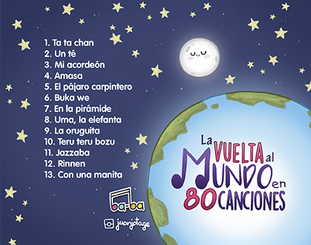 Este CD incluye 13 pistas compuestas exclusivamente por nosotros e inspiradas en diferentes países y su cultura o costumbres musicales, como Inglaterra, Francia, Italia, España, Ghana, La India, China, Japón, EEUU e Irlanda. Todas ellas ofrecen a los bebés, niñas y niños de 0 a 6 años un amplio abanico de escalas, compases y timbres para que su exposición musical sea lo más enriquecedora posible.